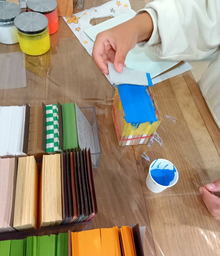 天のり製本のワークショップ製本用の糊・5色をご用意して、束ねた紙の背にあたる部分に手で糊付けする作業を体験していただきます。市場に流通するメモ帳の多くは機械で糊付けされていますが、当社では昔ながらの職人の手作業でメモ帳の製本をしています。今回、これをお子さんから大人の方まで広くお楽しみいただけるワークショップにしました。