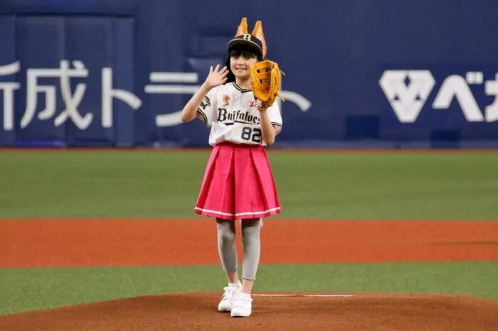 そして迎えた本番、観客でにぎわう球場内で名前がコールされると、オリックス・バファローズのユニフォームに自身が演じた、最強の子猫・ウィスカーズのイメージを加えたオリジナルのユニフォームで登場。