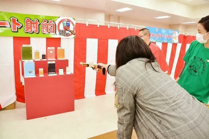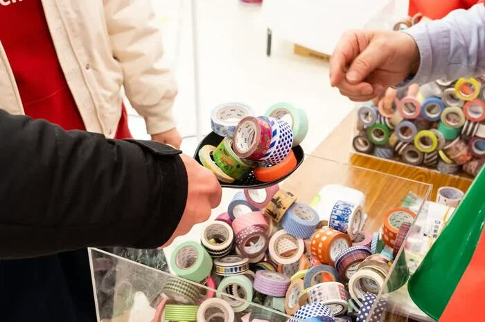 会場にはお祭り気分を盛り上げる、文具を使った「文具縁日」も開催されており、「マスキングテープすくい(1回500円+税)」「ノート射的(無料)」「カラーペン輪投げ(無料)」が楽しめる。