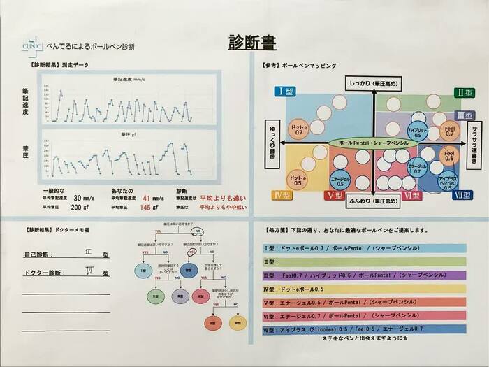 この診断結果に合わせたペンを試し書きさせてもらうと、たしかにこれまで使用していたペンよりもスラスラとした書き心地が得られた。即座にそのペン「エナージェル0.7(定価200円+税)」を購入したのは言うまでもない。(ボールペン診断は所用時間約15分)