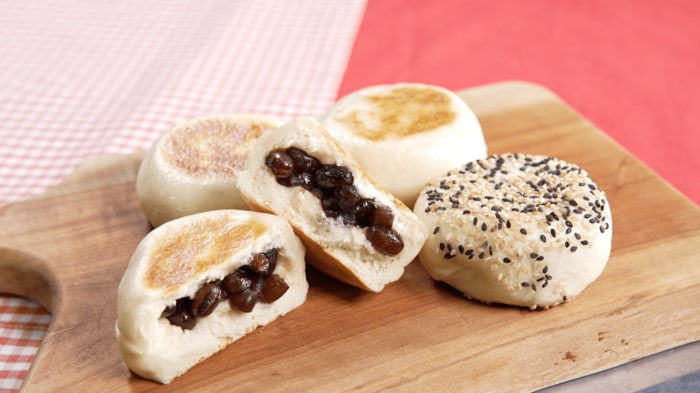 その生地に甘納豆や、ピザソースとチーズなどを入れて丸めたら、クッキングシートを敷いたフライパンに並べて焼いていきます。