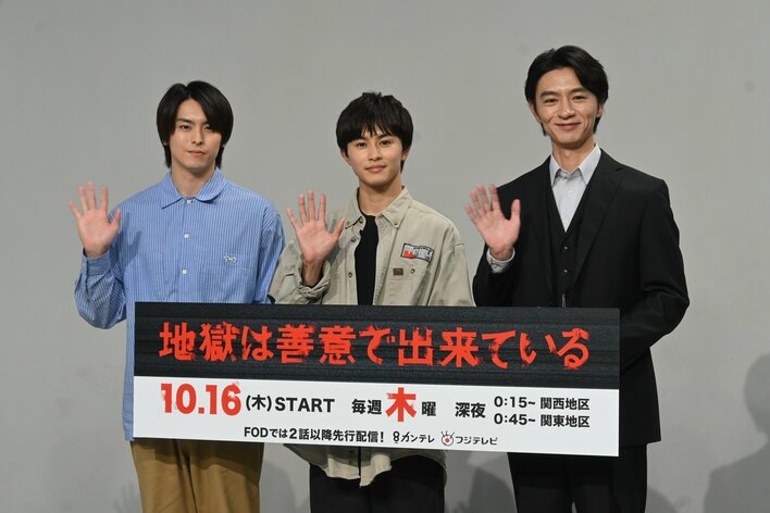 ドラマ『地獄は善意で出来ている』の取材会が10月16日に行われ、草川拓弥さん、高野洸さん、細田善彦さんが出席しました。