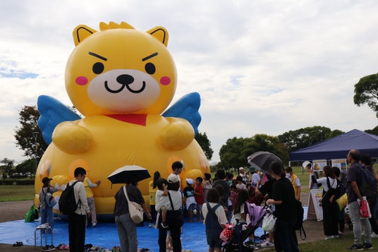 筑後市PRキャラクター「はね丸」のふわふわ遊具!大きなはね丸の中で跳ねたり転がったり、