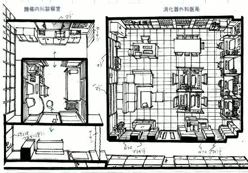 柳川:セットにスケール感を出すために、長い廊下をデザインしたかったのですが、ここでもスタジオサイズの問題が出てきて。そこで監督には、セットを二層構造にして2階に医局を置くことで、医局の背景に下を走る長い廊下を映り込ませるという提案をしました。