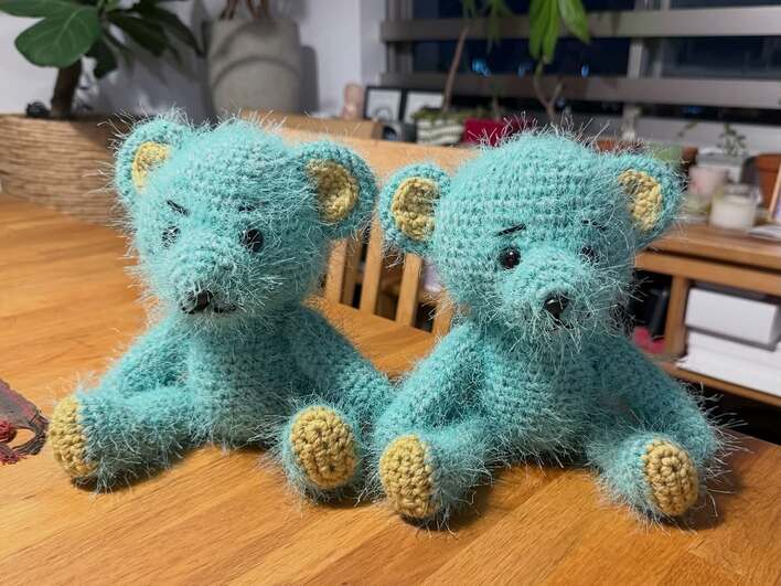 写真には、ふわふわとした素材で編まれた水色のぬいぐるみが2体写っています。バランスの取れたフォルムや丁寧な編み目は、売り物かと思うクオリティで驚くばかり。