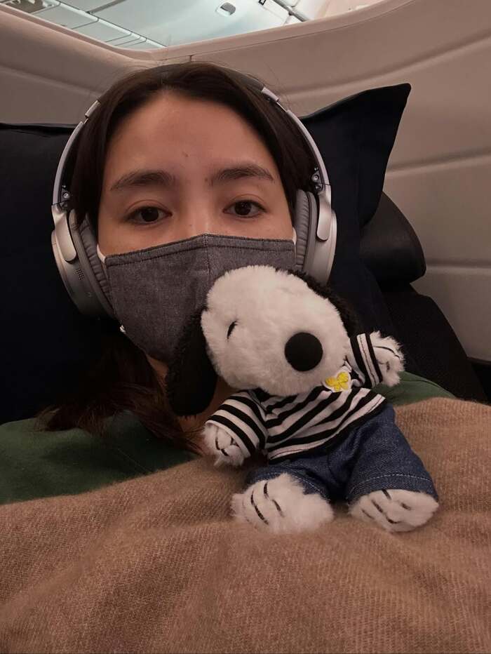 他にも、飛行機内でのショットも公開していて、ここでも手をピンと伸ばしたスヌーピーが!