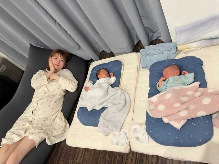 出産当日には、生まれたばかりの双子を胸に抱き、幸せに満ちあふれた表情をしたショットを投稿していました。