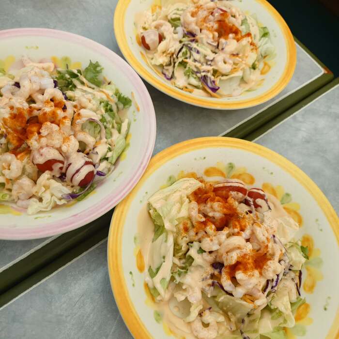 思い出の味『小エビのサラダ』は、1人1皿を注文。