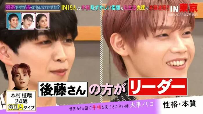 INIは2021年にデビューした、11人組のグローバルボーイズグループ。今回はメンバーのうち、木村柾哉さん、後藤威尊さん、許豊凡さん、髙塚大夢さん、田島将吾さんの5人が占われました。