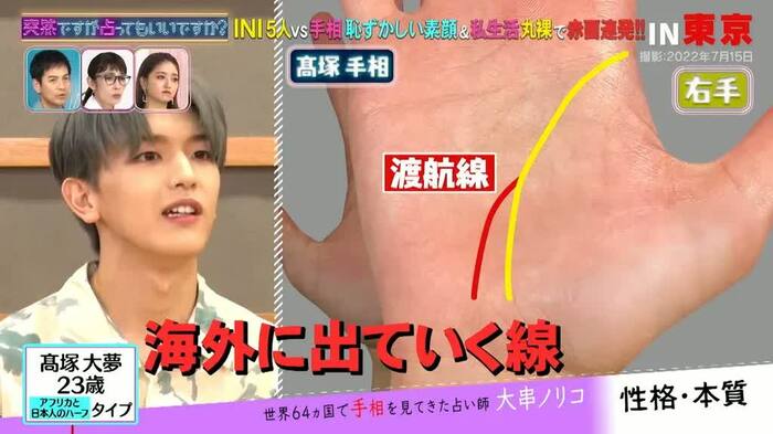 髙塚さんについて、大串さんは「ますかけ線がある。“天下を取る手相”」と告げました。さらに、海外に出ていく「渡航線」が見られるため、「フィールドを世界に広げると大化けする」のだそう。