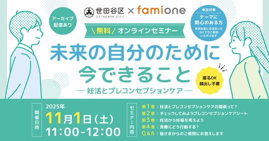「子どもを願うすべての人によりそい 幸せな人生を歩める社会をつくる」をビジョンに掲げ、法人の従業員向け福利厚生や自治体の住民向け支援を行うヘルスケアサポートサービス「ファミワン」 https://famione.com/benefit/などを展開する株式会社ファミワン(本社:東京都渋谷区、代表取締役:石川勇介)は、令和4年度から継続して提供している東京都世田谷区(区長:保坂 展人、以下 世田谷区)の「妊活オンライン相談事業」の一環として、無料オンライン講演会「未来の自分のために今できることー妊活とプレコンセプションケアー」を2025年11月1日(土)に開催します。