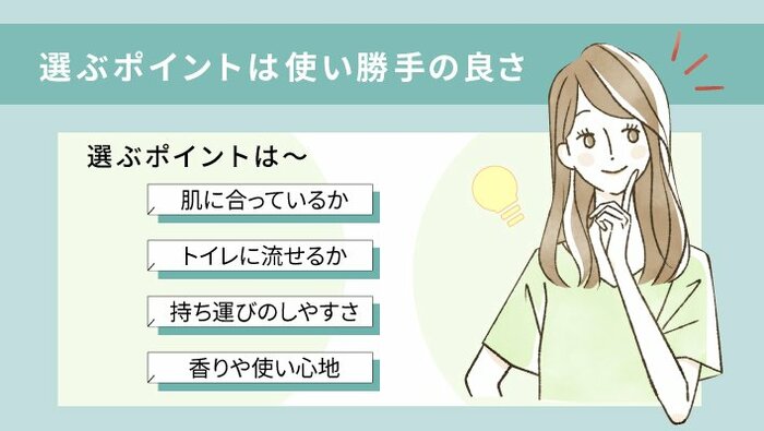 デリケートゾーン用シートの選び方を、相性と利便性の観点から4つに分けて解説します。