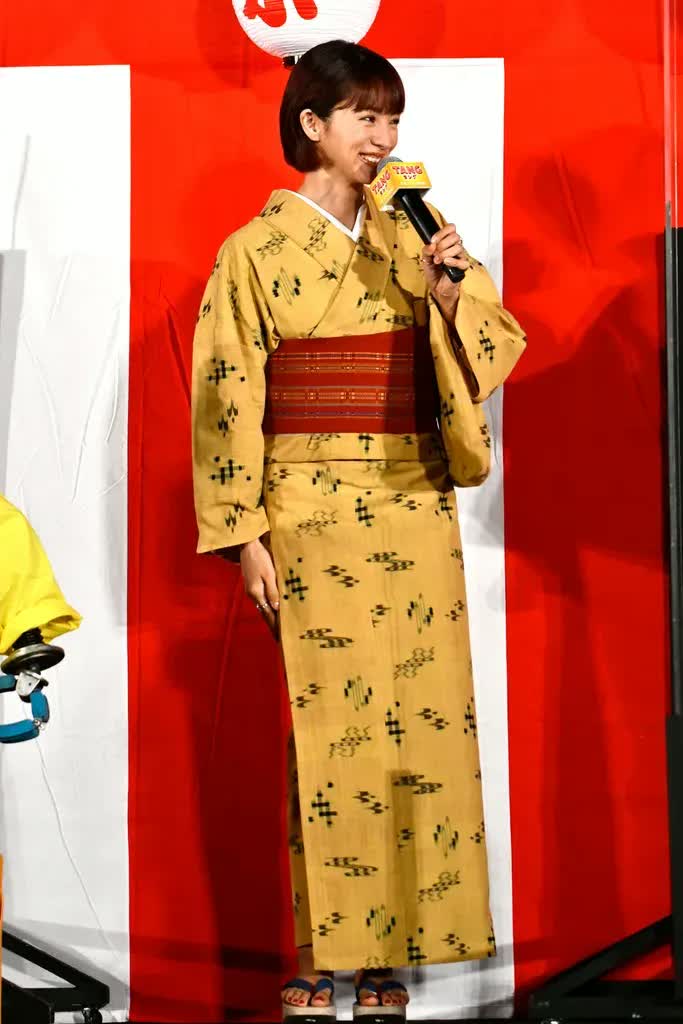 満島さんは「この浴衣は、自前です。沖縄の柄で、タンスに埋まっていたものを着させていただきました」と紹介しました。
