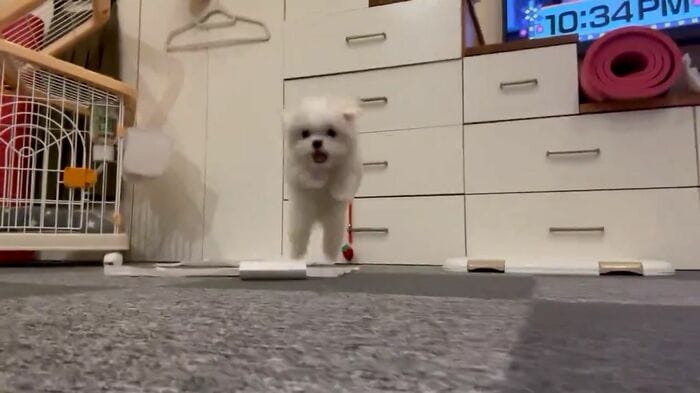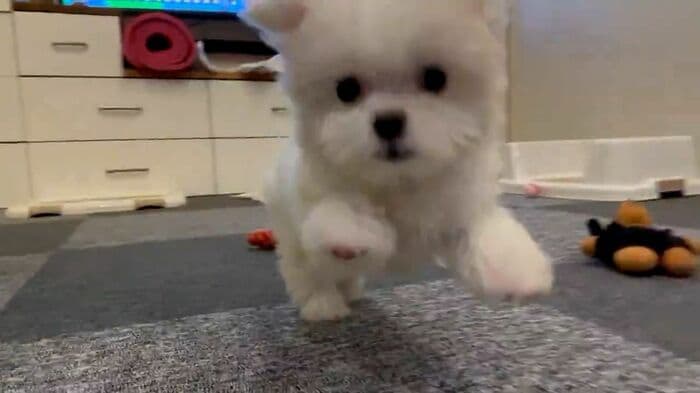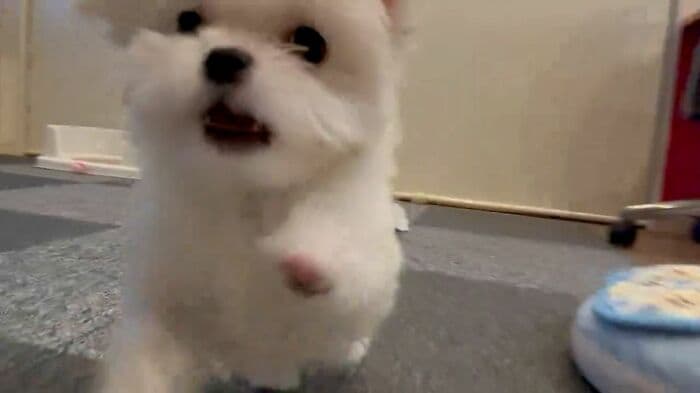 飼い主さんが中腰の姿勢でスマホを持ってみたり、セルカ棒にスマホをつけたりすることで、まるでペシュちゃんに狙われているような視点の動画が撮影されているんです!