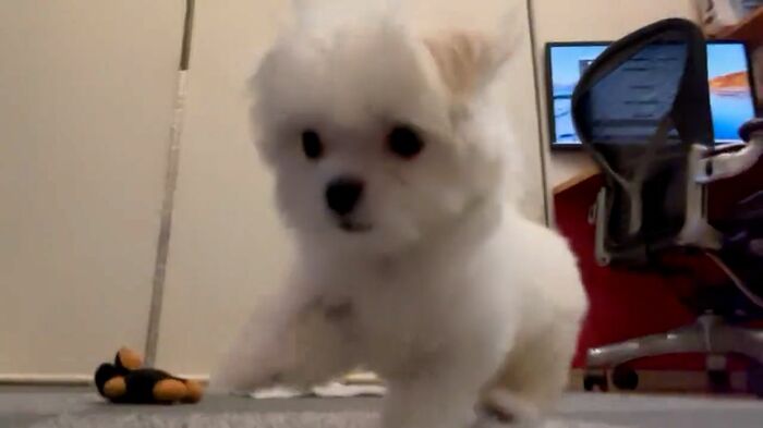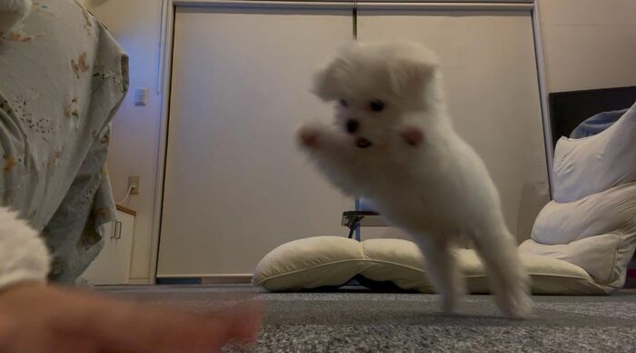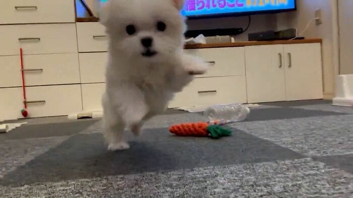 今回話題になったのは、飼い主さんが「いぬに獲物として狙われるのを体感できるよ」というコメントとともにXに投稿した、ペシュちゃんがおうちで遊んでいるときの動画。
