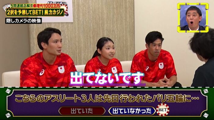 問題:別室にいるアスリート3人は、先日行われていたパリ五輪に…出ていたor出ていなかった?
