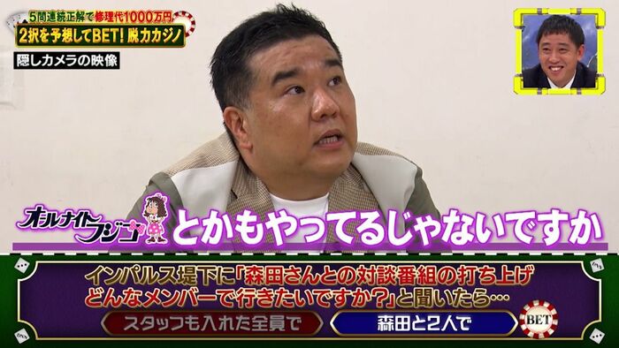 問題:インパルスの堤下敦さんに「森田さんとの対談番組の打ち上げ、どんなメンバーで行きたいですか?」と聞いたら…「スタッフも入れた全員で」と答えるor「森田と2人で」と答える