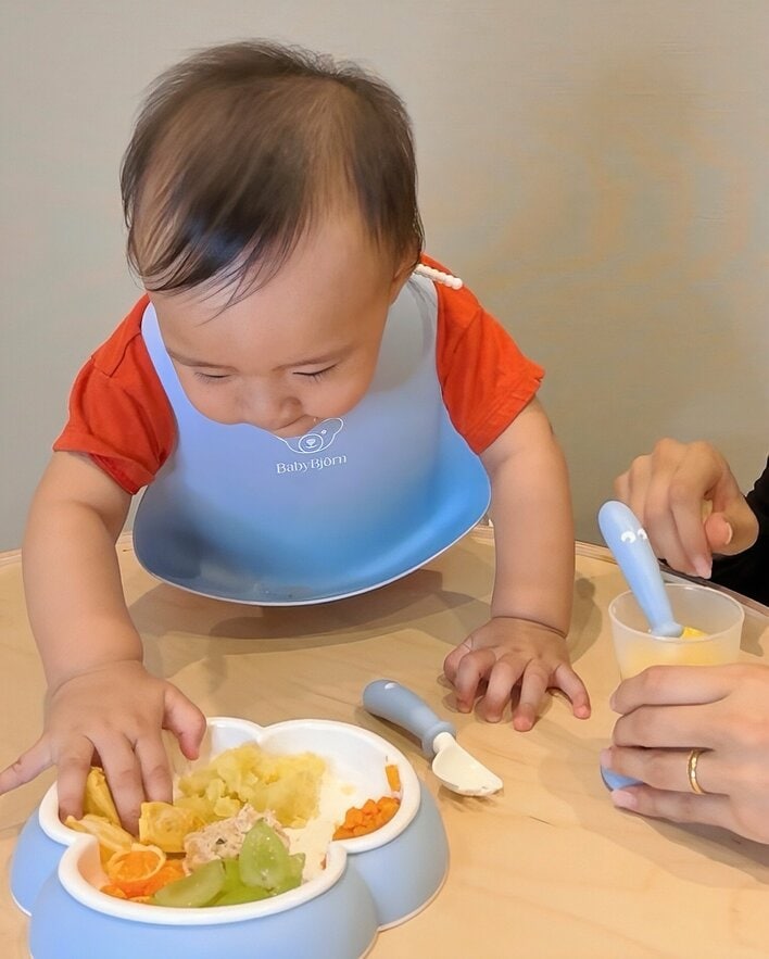 公開された写真には、細かく切られた野菜やフルーツが盛られたお皿を前に、スタイをつけてちょこんと座った陽太くんが、片手に持ったフォークをパクッと口にしている姿が!