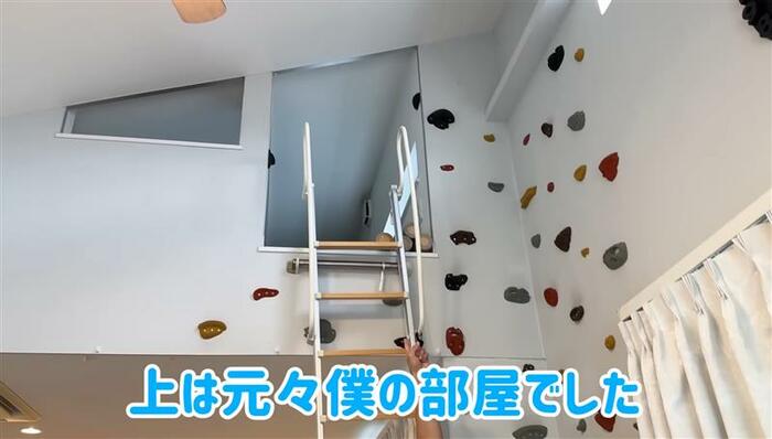 元リビングの壁の隅には、なんと天井の高さにまでボルダリングの設備が!