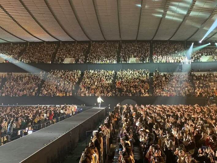 ゆっくりと会場を見渡しサングラスを外すと会場のテンションは爆上げ。キメていた表情からフッと笑顔になった瞬間がスクリーンに映ると、もはや悲鳴のような歓喜の声が響き渡った。