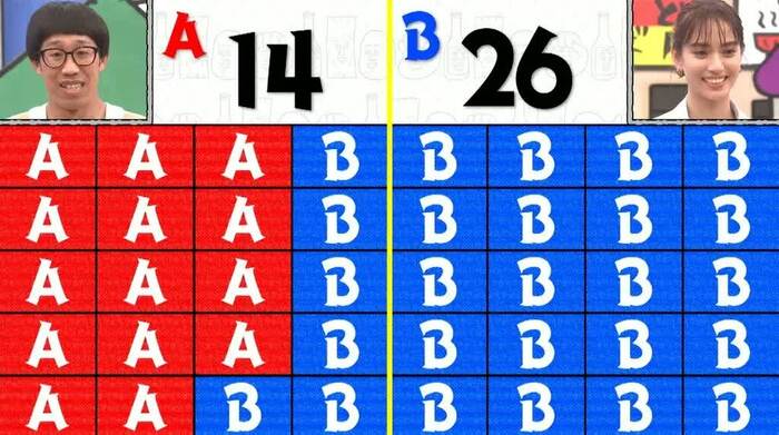 お題に対して、別室にいる20代から50代までの女性40人がちょうど20対20になる2択の選択肢を考えることができれば、10万円の賞金をゲットできます。