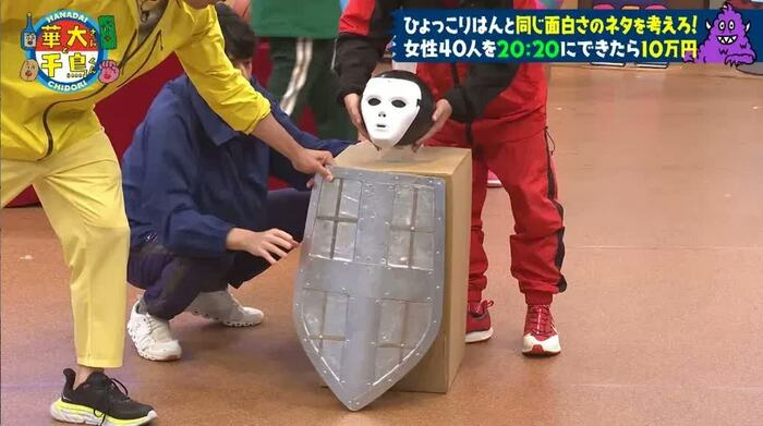 みな、用意された小道具を使ってボケるなか、滝沢さんは独特の世界観でネタを考案。ボーリングのピンと仮面に向かって呼びかけ…。