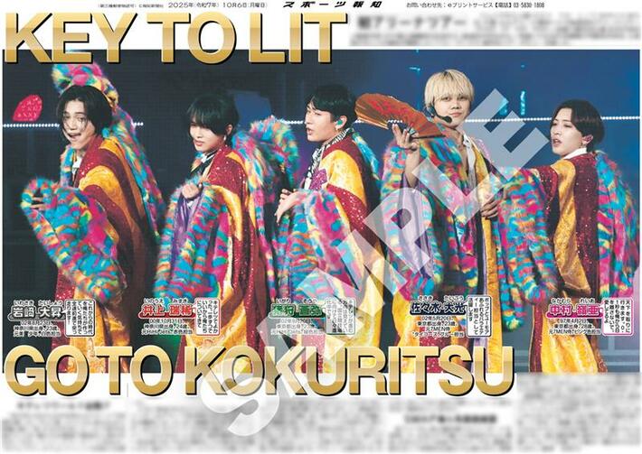 スポーツ報知を発行する報知新聞社(代表取締役社長・長谷川剛)は新聞の一部紙面をコンビニエンスストアのマルチコピー機からプリントできる「スポーツ報知コンビニプリント」サービスを展開中。スポーツ紙ならではの大きな写真を使った紙面をプリント版として販売しています。10月6日付掲載、ジュニアの5人組・KEY TO LIT(キテレツ)の自身初のアリーナツアー「WAKE UP THE FOOL」の千葉公演最終日の紙面を発売。全員パターン3種類と個人パターン5種類の合計8種類です。