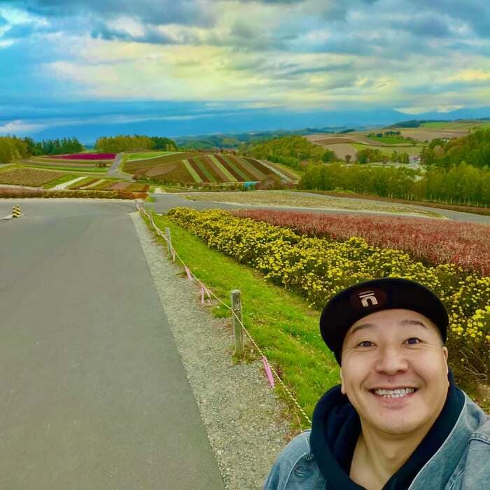 投稿された写真を見ると、北海道の観光名所「四季彩の丘」の色鮮やかな花畑をバックに笑顔で写る長田さんの姿が。
