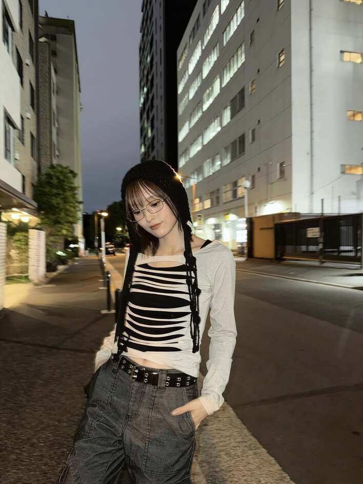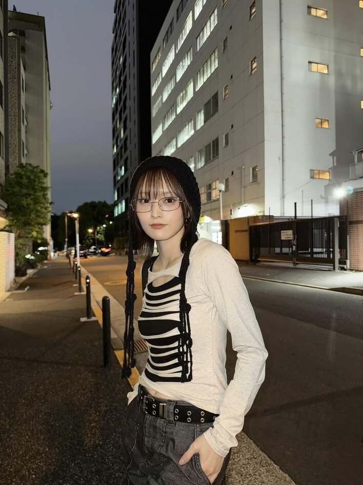公開された写真には、夜の街並みで個性的なデザインのトップスにパンツスタイルでメガネをかけた山本さんがおさめられています。