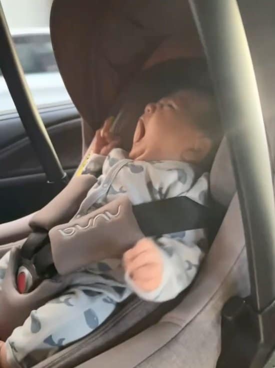 ベビーカーに息子を乗せ、楽しそうな笑顔で買い物を満喫しているようです。つづけて、ベビーカーに横たわる息子の動画を公開。