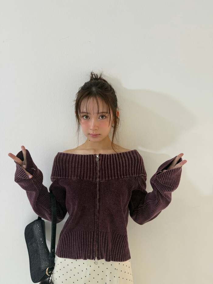 デコルテが目を引く肩だしニットを身につけ、ダブルピースをする姿や、