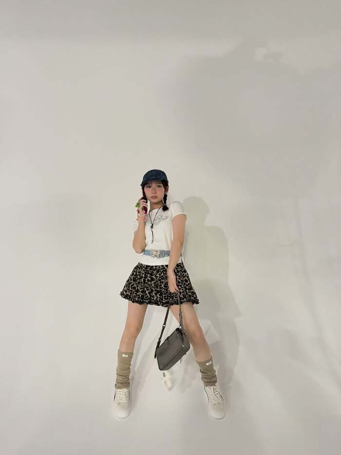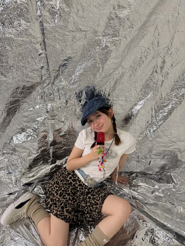 笑顔を見せる畑さんの手には、たくさんのアクセサリーが付いたガラケーが握られています。おさげヘアにハンチングハット、白色のTシャツにヒョウ柄のミニスカを合わせた、“平成ギャル”を思わせるようなコーディネートです。