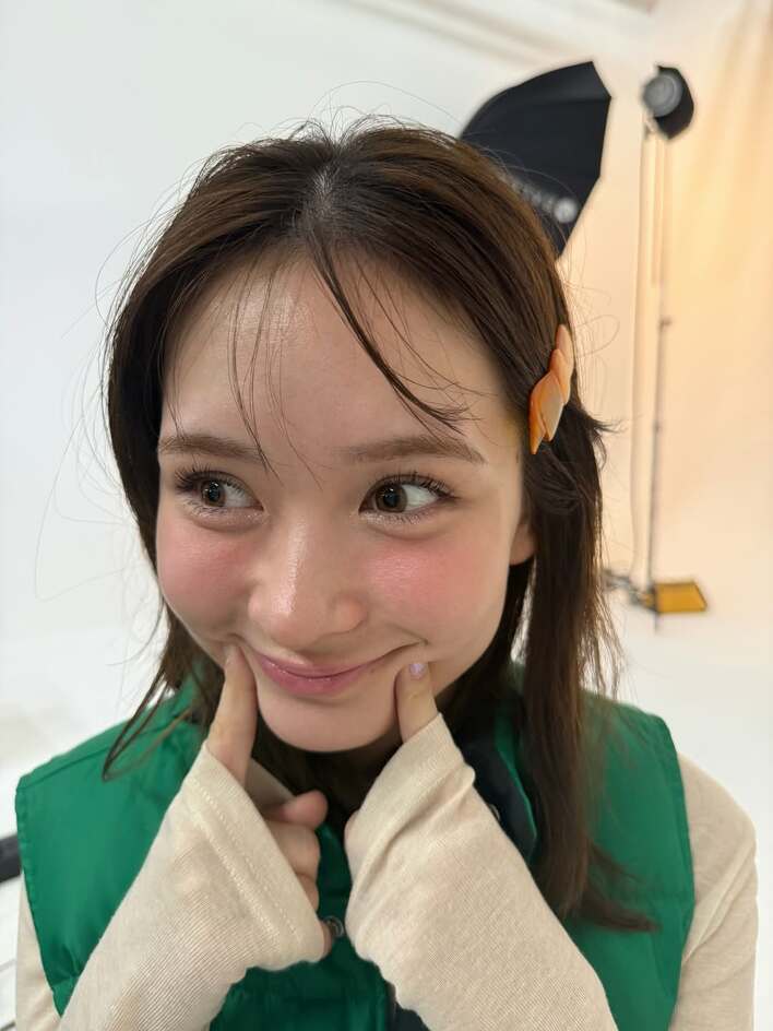 両手の人さし指を口元に当て、ニコッと笑う どアップショットも。