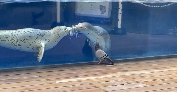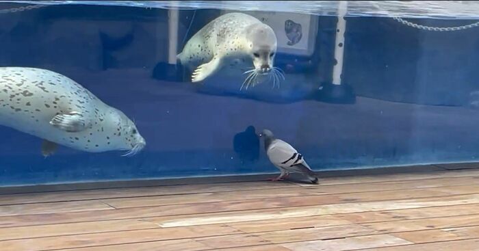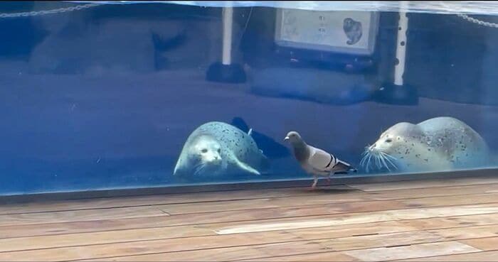 姉妹の前に現れたのは1羽のハト。見慣れない珍客にアザラシ姉妹も興味津々の様子でガン見しています。