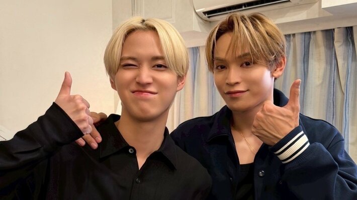 肩を組み、笑顔でグッドポーズをする2人。「なんと!スピンオフ撮影日にJO1のリーダー 與那城奨さんが美味しい差し入れを持ってやって来てくれました」と投稿文にある通り、與那城さんが白岩さんをはじめ、キャストやスタッフを労うために現場を訪れたよう。