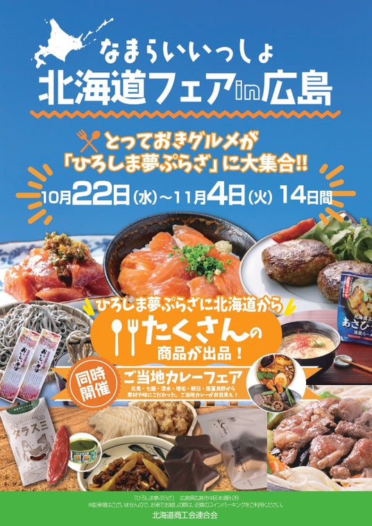 北海道商工会連合会では、昨年に引き続き、北海道の魅力を一堂に集めた「なまらいいっしょ北海道フェアin広島」を、ひろしま夢ぷらざ(広島市中区本通8-28)にて開催いたします。 本イベントでは、道内各地から開発間もない商品や珍しい商品、こだわりの逸品が集結し、広島の皆さまに“北海道の旬”をお届けします。
