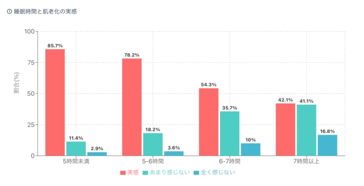 その結果、睡眠時間が6時間未満の人の約81%が肌老化を実感していることが分かりました。一方、7時間以上睡眠をとっている人では肌老化を感じる割合が約42%にとどまり、睡眠時間と肌老化の間に強い相関が見られました。