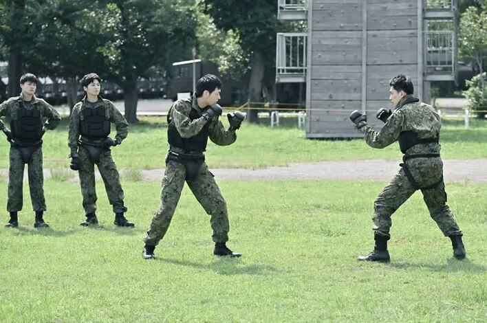 若干の不安を抱きながら隊舎に向かった宙と馬場を待っていたのは、先輩自衛官たち──班長で1曹の大木隆之(久保田悠来)、バツイチで大木の次に古株の金子慎也(桐山漣)、大木いわく駐屯地イチの爽やかイケメンだという風間速人(工藤阿須加)、年齢は班内で一番年下だが優秀な野村晴樹(結木滉星)の手荒い歓迎だった。