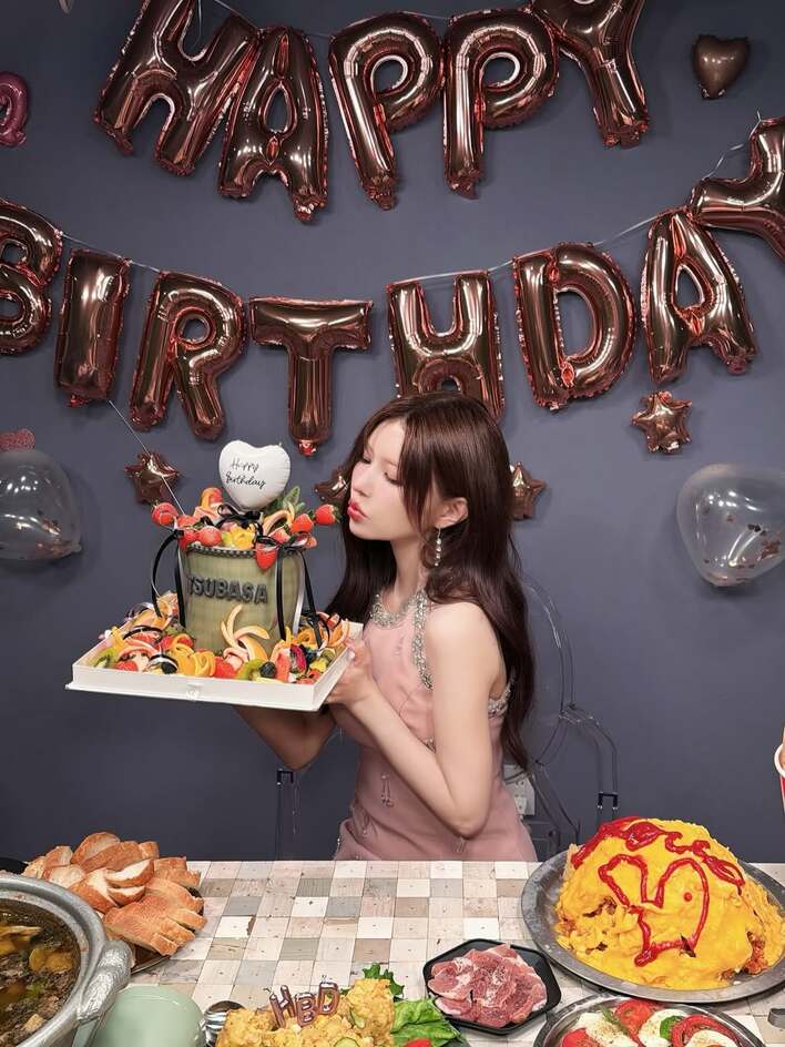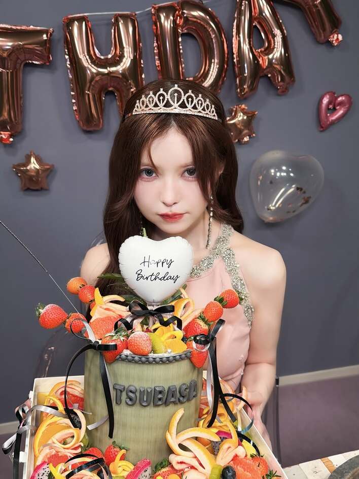 後ろには、「HAPPY BIRTHDAY」の文字やハートのバルーンが飾られた、あたたかい空間が広がっています。