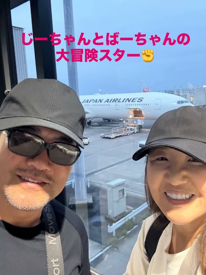 そして、「夫婦、2人旅」とつづり、出発前に空港で飛行機を背景に撮影したショットでは、2人でおそろいの黒いキャップをかぶり、いよいよ夫婦旅が始まることへの期待感があらわれているような、にっこりとした表情を浮かべています。