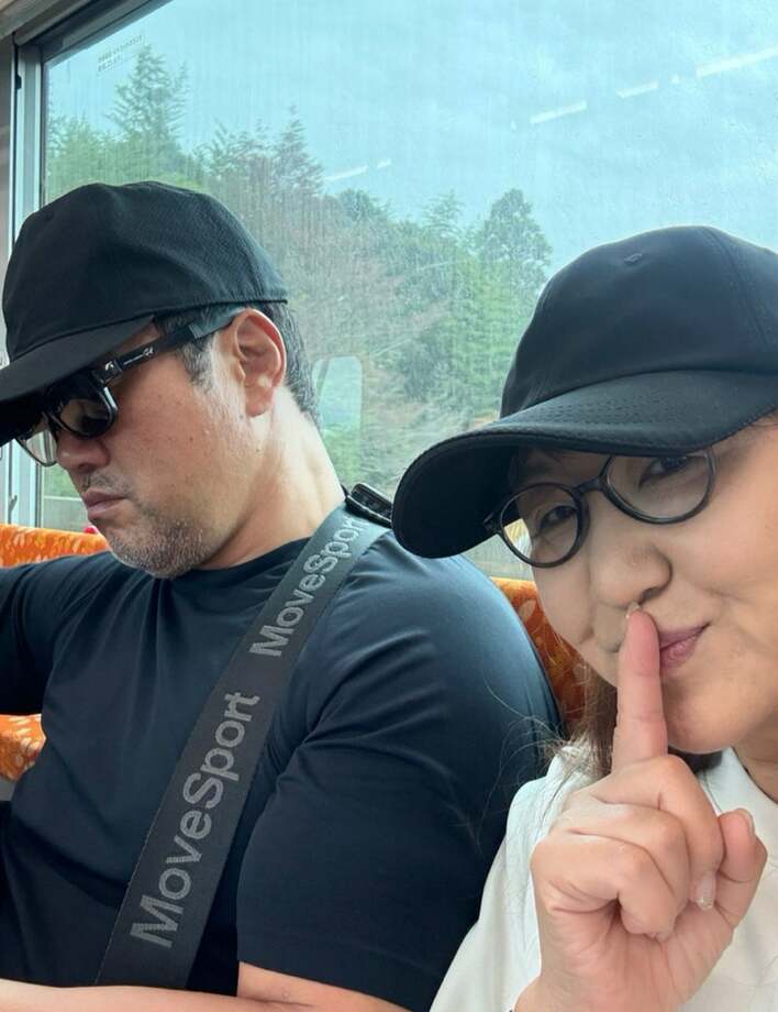 投稿された写真には、電車で2人で移動しているときに撮影したときの夫婦ツーショットが。