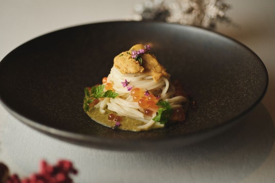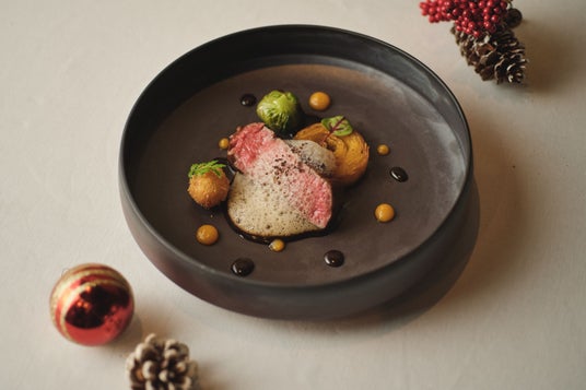 【Concerto】は雲丹や蟹など旬の食材を主役に、クリスマスのモチーフを随所に取り入れたフルコースです。前菜は"ブッシュ・ド・ノエル"をイメージした飾り付けで華やかに幕開け。キャビアのタルトやズワイガニのパイ仕立て、帆立のポタージュから協奏曲は始まります。クリスマスツリーに見立ててイクラで彩られた、冷製の雲丹のタリオリーニは、自家製のもちもち麺に、アーモンドとウニのトマトソースを絡めてお召し上がりいただきます。メインは、オーナメントに見立て、国産牛フィレをライスコロッケや、牛ほほの赤ワイン煮込みを包んだ芽キャベツなどとともに楽しく装飾。ポルチーニとモリーユ茸のエキューム(泡のソース)を添えて国産牛ならではの旨味をご堪能いただけます。デザートは、プレゼントを届けるサンタクロース目線から見た銀世界を表現。苺のスフレロールケーキやピスタチオアイスで締めくくります。