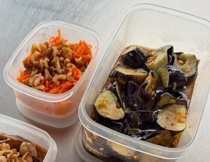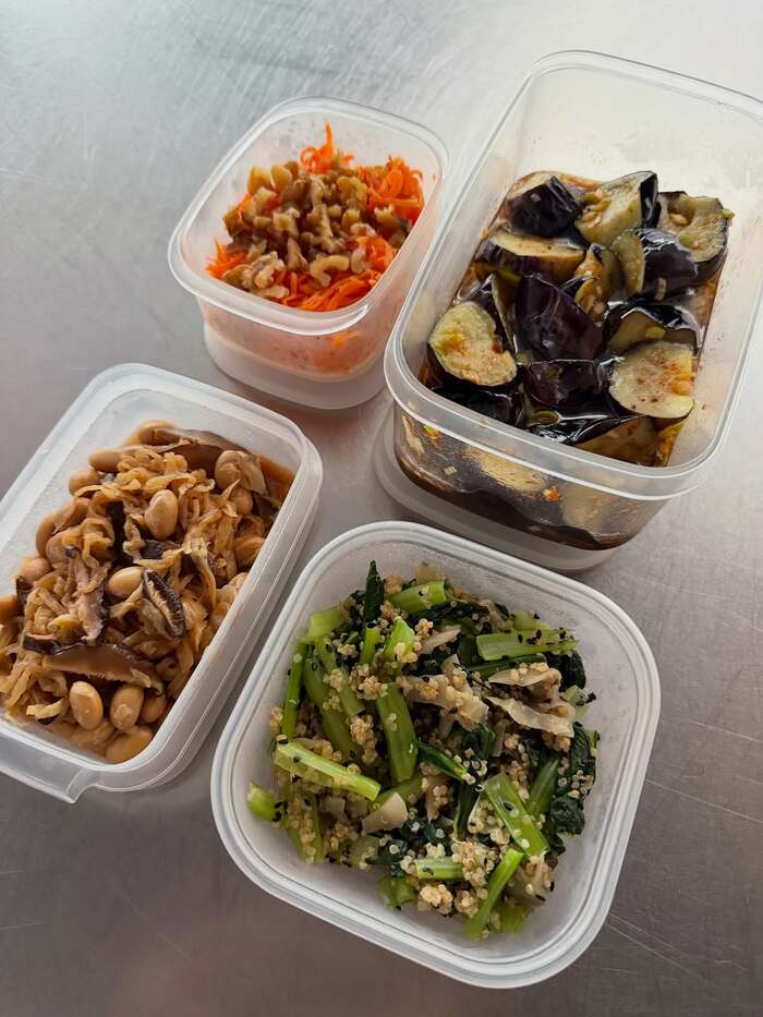 深さのある大きな容器には、乱切りにカットされたナスをピリ辛に炒めたもの。となりにある一番小さな容器には、クルミ入りの「にんじんラペ」が。