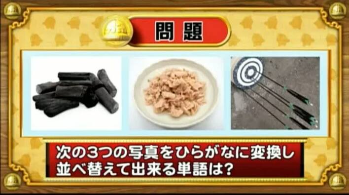 最初は「脳ミングアップクイズ」から、シャッフル写真の問題。次の3つの写真をひらがなに変換し、並べ替えて出来る単語は何でしょうか?