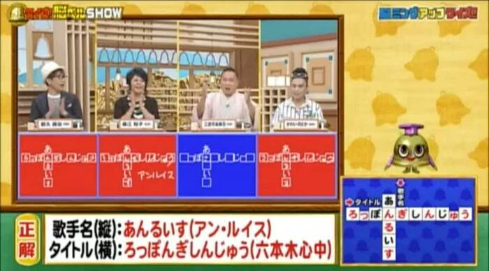 正解は、歌手名が「あんるいす(アン・ルイス)」で、タイトルが「ろっぽんぎしんじゅう(六本木心中)」。鶴久さん、桑江さん、かわいさんの3人が正解。