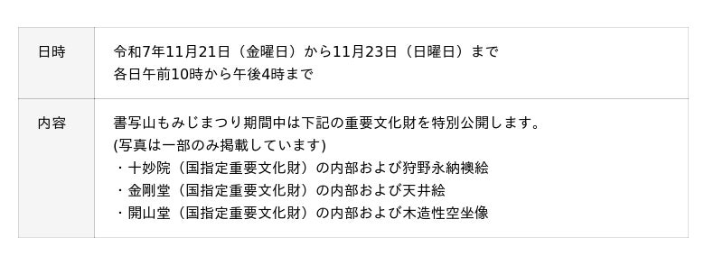 令和7年11月21日(金曜日)から11月23日(日曜日)の3日間- 文化財の特別公開は午前10時から午後4時まで実施します。