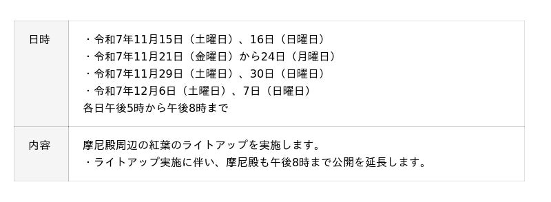 - 紅葉のライトアップは午後5時から午後8時まで実施します。