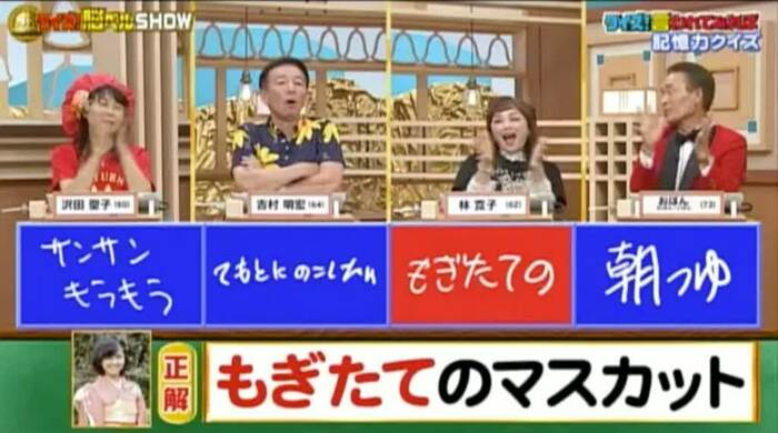 今回の解答者は、歌手・沢田聖子さん(60)、タレント・吉村明宏さん(64)、歌手・林寛子さん(62)、芸人・おぼんさん(73)の4名です。