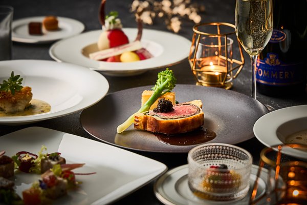 2025年9月8日にリニューアルオープンしたばかりのキュイジーヌ「エスト」では、地上100mからの夜景を眺めながら煌めくクリスマスにふさわしい洗練された極上の本格フランス料理のフルコースをお楽しみいただけます。前菜の「フォアグラ入りパテ・ド・カンパーニュ」はクリスマスリースに見立てて盛り付け、周りにオーナメントをイメージした彩り野菜を飾り、ホリデームードを演出します。スープはマッシュルームと魚介のマリアージュを味わえ、濃厚なブラウンマッシュルームと、海老、帆立貝の香りが口の中で引き立ちます。魚料理は、甘鯛の身の柔らかさと、カリっと焼き上げた鱗のサクサク感がたまらない一品です。メインディッシュの「国産牛フィレ肉のウエリントン」は、国産牛にきのこのペーストをまとわせ、パイで包んで焼き上げました。しっとりジューシーな肉質をパイのコクやきのこの旨みとともに、トリュフを使った贅沢で濃厚なソースでご堪能ください。クセが少なく柔らかな「ニュージーランド産骨付き仔羊のロースト」は、素材の味を生かしつつ、上品な香りと爽やかな味わいが特徴のパースニップ(白にんじん)のピュレと一緒にお召し上がりください。ホワイトチョコレートでコーティングされたドームを割ると、あまおう苺とベリーのソースがとろりと出てくる印象的なデザートで食事を締めくくります。美味しい食事と洗練されたスタッフによる接客で贅沢なクリスマスをお楽しみください。