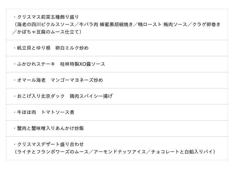 ツリーをイメージしたマッシュポテトがのった前菜盛り合わせや、特別な時期のランチメニューでしか登場しない、“ふかひれ姿煮”を贅沢に使った蟹肉入りスープ、桂林特製のXO醤ソースと合わせた「牛肉サイコロステーキ」など、クリスマス期間にふさわしい中国料理ならではのランチ限定スペシャルコースをご用意いたしました。【メニュー】 クリスマスランチコース ¥5,500